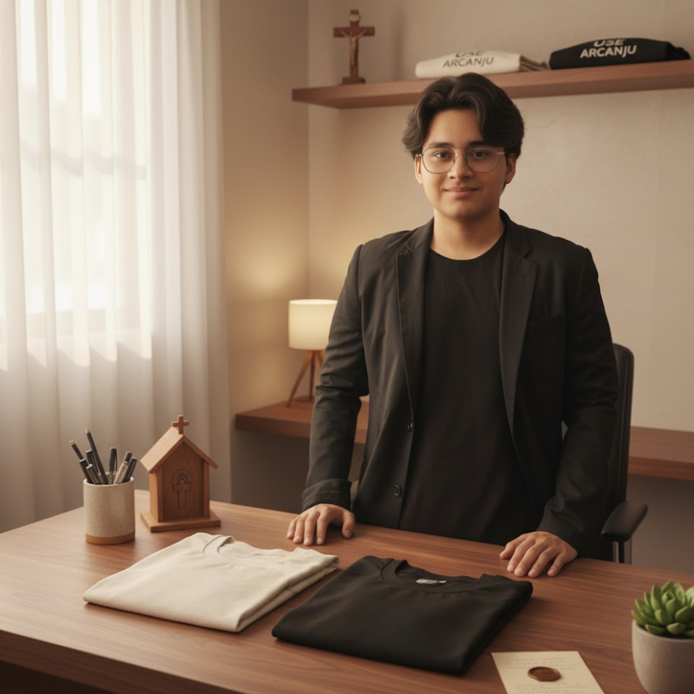 Meu nome é Mateus Arcanjo, sou o fundador da marca e acredito que vestir-se é também uma forma de evangelizar — de mostrar ao mundo quem somos e no que acreditamos, com autenticidade e bom gosto.